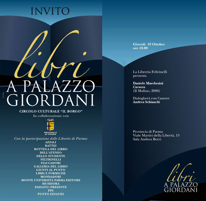 LIBRI a Palazzo Giordani Nella Sala Borri di Palazzo Giordani in via Martiri della Libertà giovedì 19 ottobre, alle ore 18, si terrà il 2° appuntamento del ciclo ""Libri a Palazzo Giordani" curato dal circolo Il Borgo con il patrocinio della Provincia e la collaborazione di 15 librerie di Parma. La Libreria Feltrinelli presenterà il volume di Daniele Marchesini "Carnera". Insieme alla storia del famoso pugile il libro mette in risalto l’epopea dell’emigrazione nella storia d’Italia. Andrea Schianchi ne curerà la presentazione.